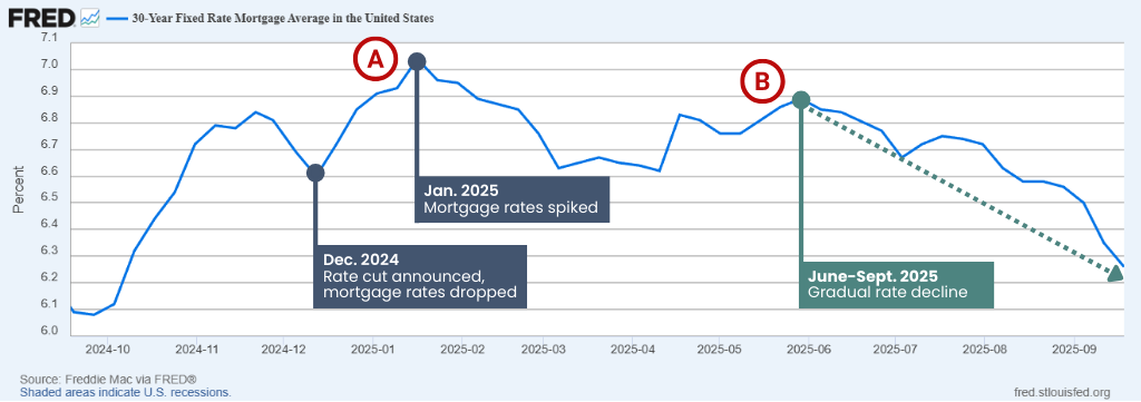 B: In the second half of 2025, mortgage rates have been on a gradual decline, with the expectation that rate cuts were coming, and did happen last week. Given the Fed’s indication of two additional cuts before the end of 2025, we’re optimistic there won’t be another spike. Time will tell, and we’ll keep you posted.